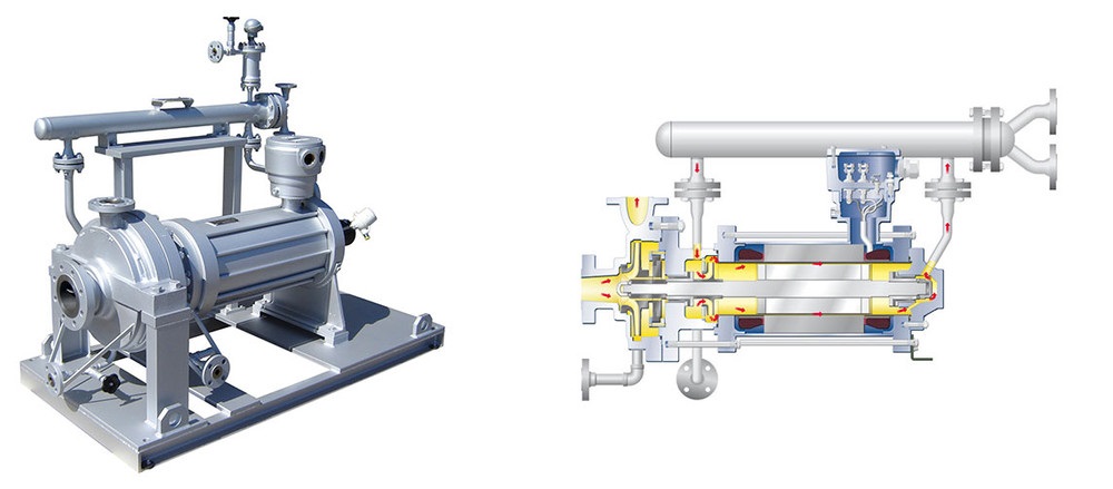 Often designed for extreme conditions, canned motor pumps are used when liquids and gases with extreme temperatures and potential hazards are pumped. These completely enclosed centrifugal pumps in monobloc design are driven by a canned motor thanks to a common shaft using electromagnetic principles. A partial flow is used to cool the motor and lubricate the two identical hydrodynamic slide bearings. After flowing through the gap between rotor and stator, the partial flow is fed back through the hollow shaft to the pressure side of the impeller. For high-temperature applications, HERMETIC offers two distinctive designs: canned motor pumps with externally cooled motors and canned motor pumps with adequate internally cooled motors.